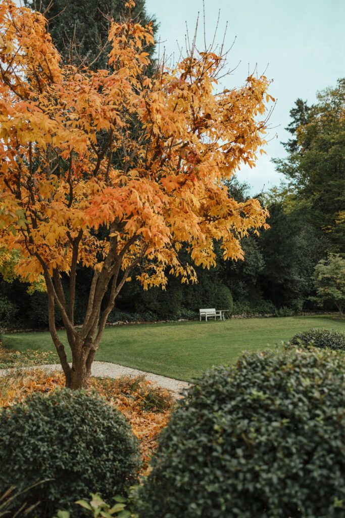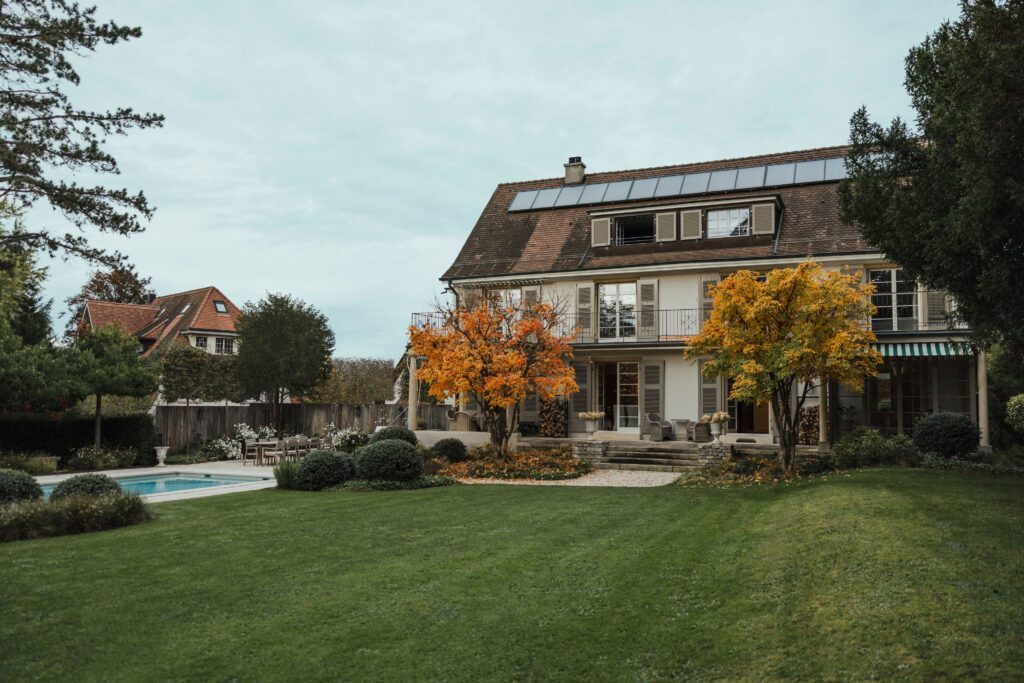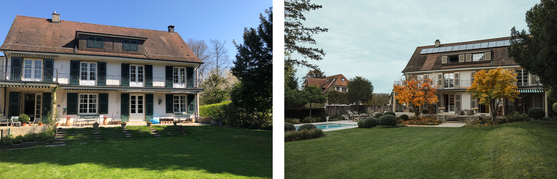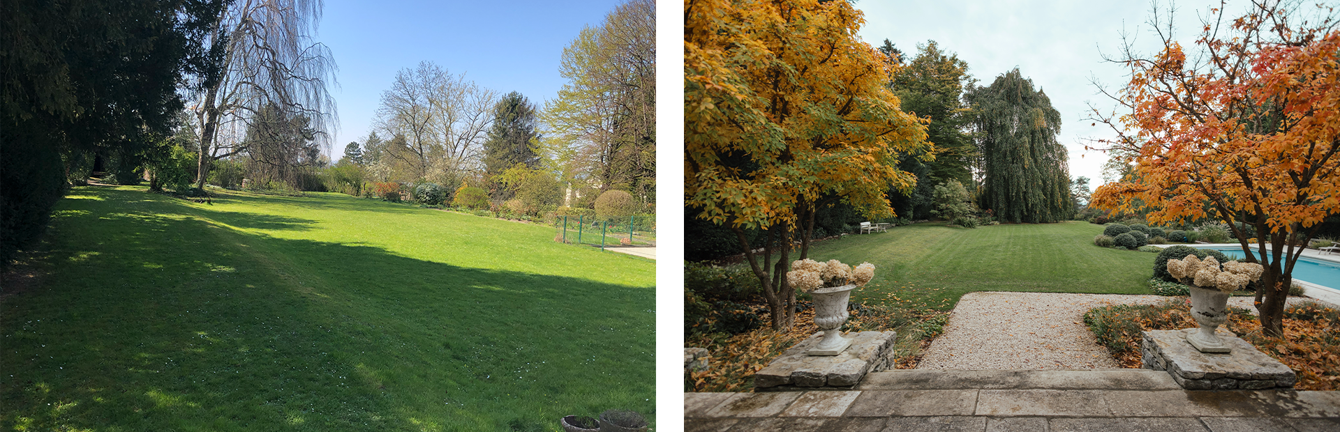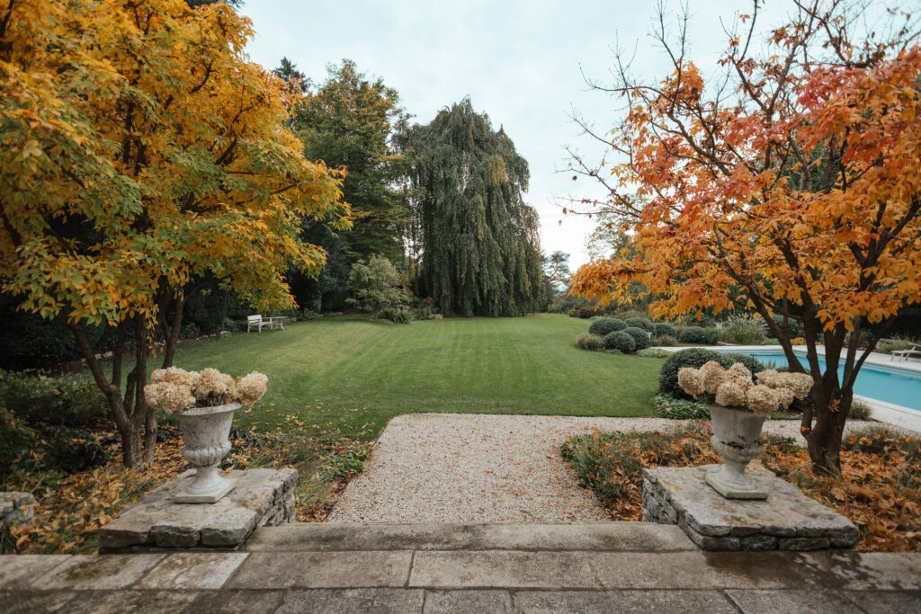 Simon Rüegg durfte rund einen Drittel dieses parkähnlichen Grünraums neu gestalten – was nichts anderes bedeutet, als dass ein «Garten im Park» entstanden ist. Die Weiträumigkeit des Anwesens ist beeindruckend. Die bestehenden Grossbäume unterstreichen die Wirkung von Weite und Offenheit. Kein Wunder, geht der Blick vom Haus aus – eingerahmt durch zwei Bäume – hindernisfrei in die Ferne.
