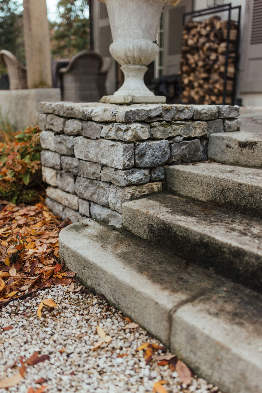 Antike Kalksteinplatten bilden den Stufenaufgang vom Garten in den Hausbereich. Auf einem aufgemauerten Podest – gebildet aus zahlreichen Kalksteinen – steht ein Ziergefäss. Die Verbindung zwischen Haus und Garten verrät eine grosse Natürlichkeit. Sie wird sowohl auf dem Material als auch in den Formen manifest. Die Zeit hinterlässt grosse und kleine Spuren.