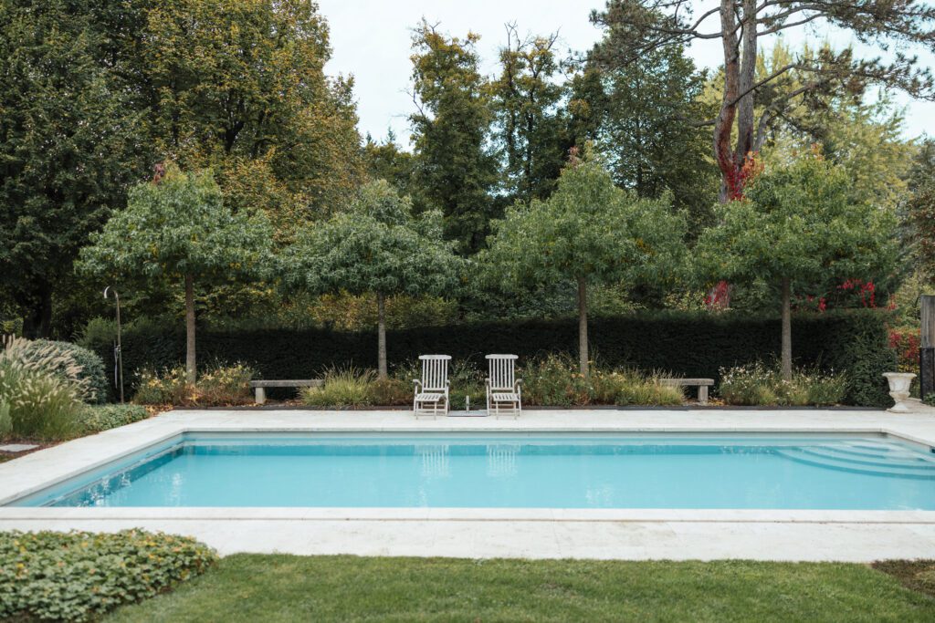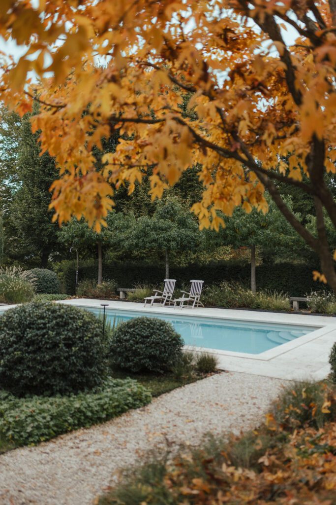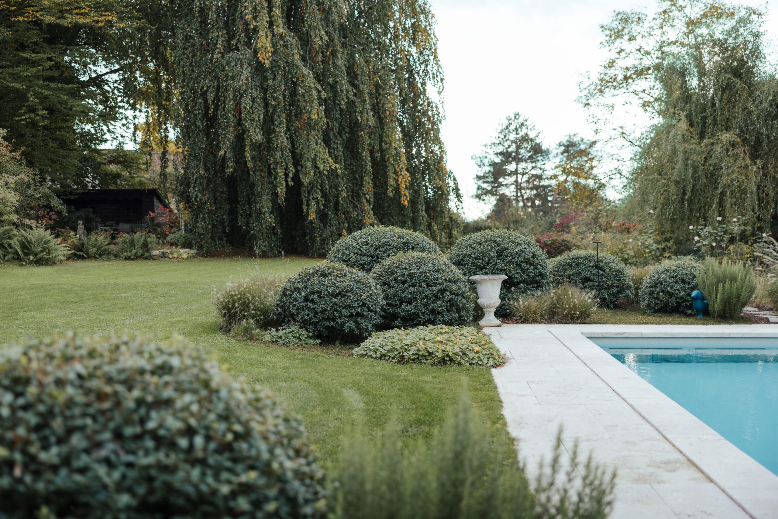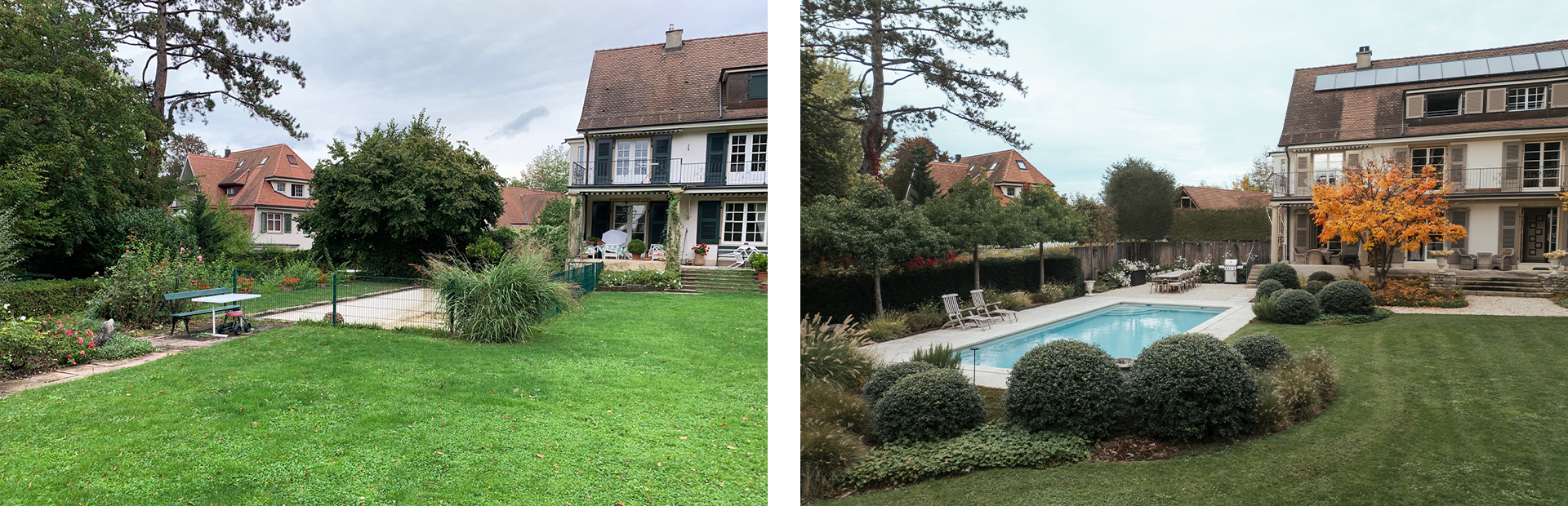 Das Gestalten im Bestand stellt hohe Anforderungen. Es gilt, die angemessene Balance zwischen Neuem und Bestehendem zu finden – eine Balance, die die Grenzen dazwischen verwischt und somit eine neuartige Gesamtoptik zur Entfaltung bringt. Dieser Garten ist ein Beispiel dafür. Ein wichtiges Gestaltungsdetail: Flacher, kugelförmiger Osmanthus säumt den Poolbereich, was wie ein Schutz wirkt und für eine intime Raumwirkung sorgt.